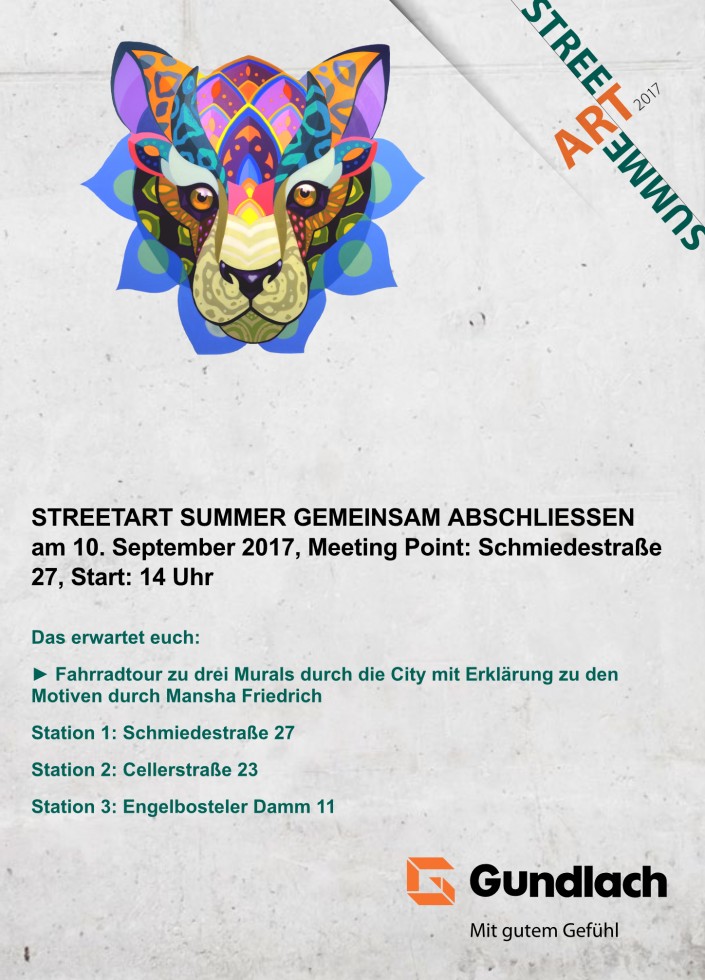 >>Anmeldung: Wir freuen uns natürlich über jeden Teilnehmer. Um den Planungsaufwand für uns überschaubar zu gestalten, bitten wir um vorherige Anmeldung bis zum 6. September an streetart@gundlach-bau.de.