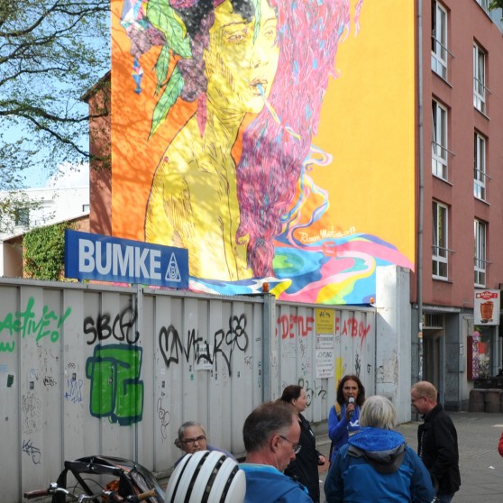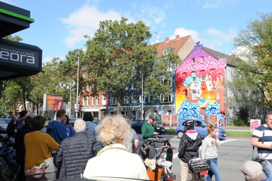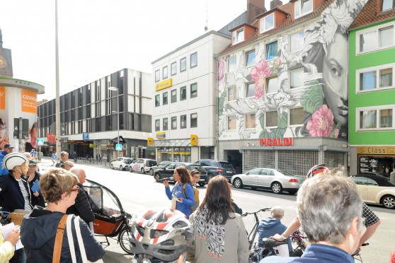 "Mit ihnen gehört die Häuserkunst nun auch zum Stadtbild Hannovers", sagte Künstlerin Mansha Friedrich auf dem 30. Entdeckertag zu den 40 Besuchern der Fahrradtour zu drei der insgesamt sechs Wandmalereien auf Gundlach-Häusern. Friedrich managte für Gundlach das "Street Art Summer" Projekt mit sechs internationalen und hannoverschen Künstlern.