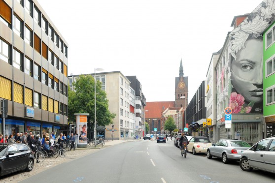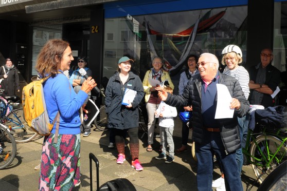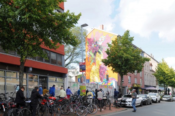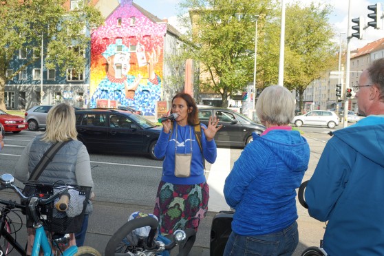 Die Radtour begann vor dem Kunstwerk "Das Seemonster" von Lula Goce. Teodro Calvo-Lopes, seit 30 Jahren Gundlach-Mieter in der Schmiedestraße 27: "In Spanien, meiner Herkunft, ist Wandmalerei sehr beliebt. Ich freue mich jeden Tag über das Kunstwerk. Natürlich ganz besonders, weil es von einer Landmännin stammt. Als sie es gemalt hat, haben wir uns oft unterhalten." (www.gundlach-bau.de/street-art-summer/lula-goce.html).