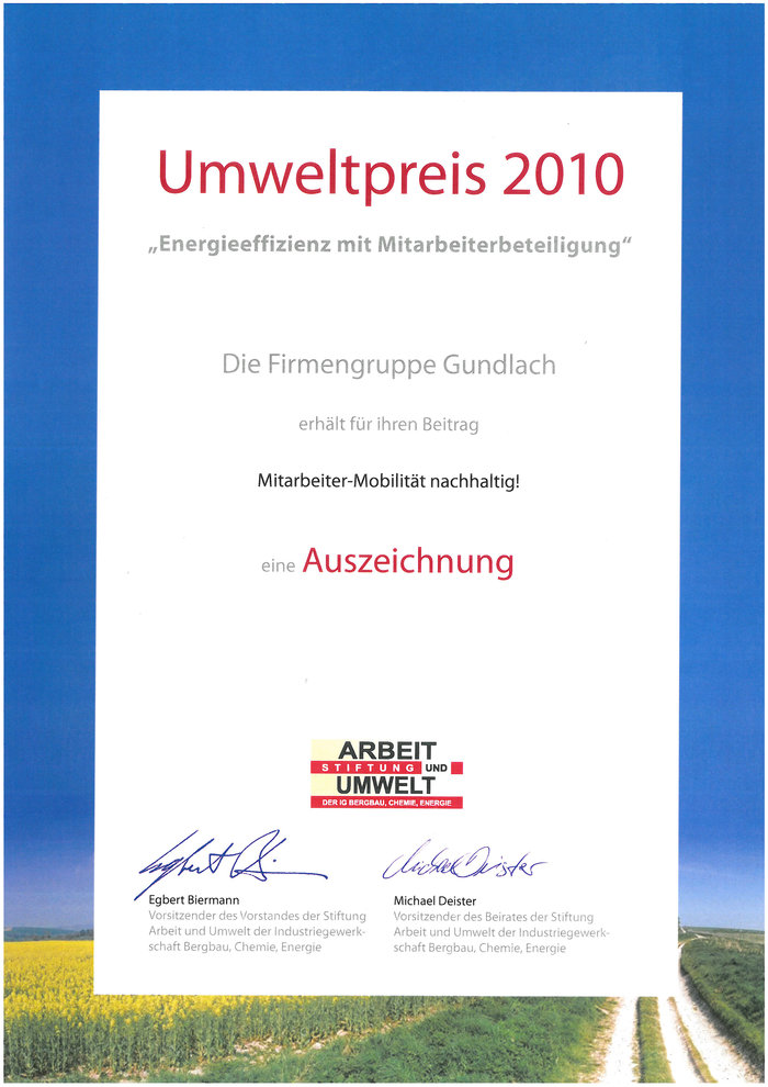 Auszeichnung im Umweltpreis 2010 der Stiftung Arbeit und Umwelt "Energieeffizienz mit Mitarbeiterbeteiligung" für den Beitrag Mitarbeiter-Mobilität nachhaltig!