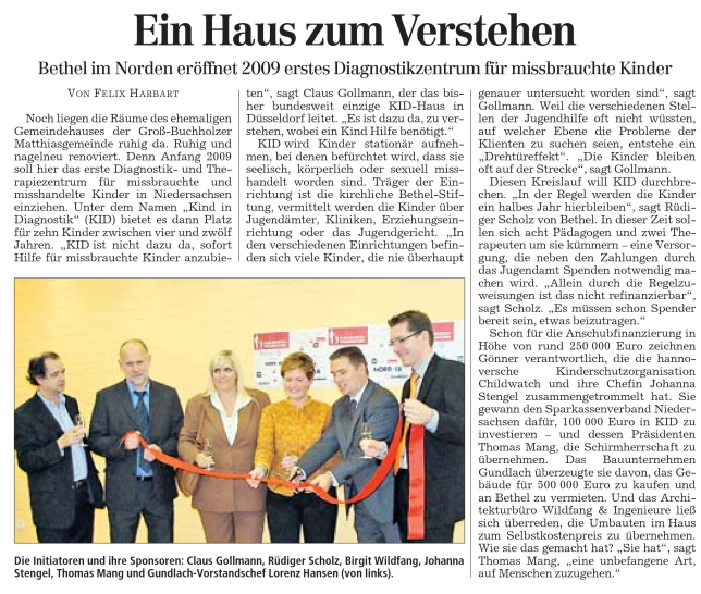Die CHILDWATCH FOUNDATION eröffnet gemeinsam mit der Anstalt Bethel Diakonie Freistatt, dem Mieter der Gundlach GmbH & CO. KG Wohnungsunternehmen, im Norden das erste Diagnostikzentrum für gewaltgeschädigte Kinder. Im Dezember 2008 soll der Betrieb in dem ehemaligen Gemeindehaus aufgenommen werden. Ziel des Projektes ist es, den Kindern sowie ihren Familien ein Hilfsangebot anzubieten. In der Gruppe werden für einen begrenzten Zeitraum von ca. sechs Monaten 12 Kinder im Alter von ca. vier bis zwölf Jahren leben, die rund um die Uhr betreut werden.