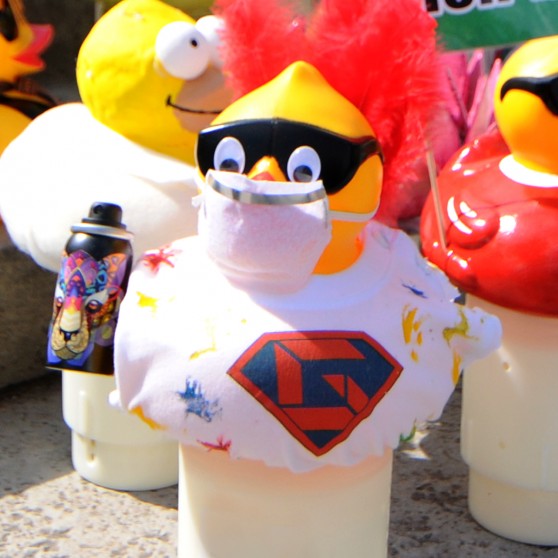 Zum Rennen der 100 Firmen "Big-Ducks" hatte sich Gundlachs Ente als StreetArt-Sprayer in Schale geworfen. Hintergrund: Aktuell werden von Street-Artists drei Gundlach-Häuser in bunte Wandmalereien getaucht. (www.gundlach-bau.de/web/aktuelles/street-art-summer-2017-es-geht-weiter.html)