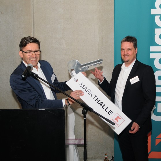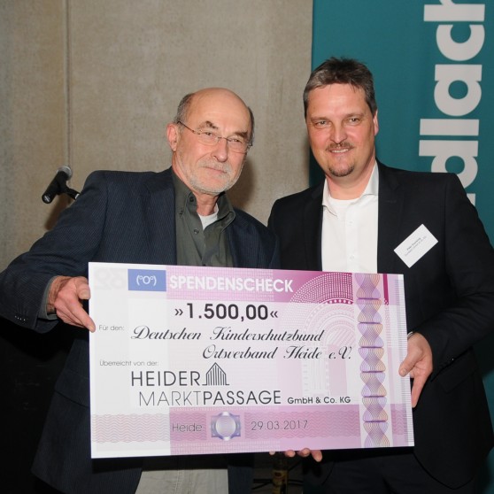 Peter Duensing, Gundlach Prokurist und Geschäftsführer der Heider Marktpassage, bedankte sich auf der Einweihungsfeier bei allen Akteuren und toastete mit Bürgermeister Stecher auf das Erreichte und die zukünftige Zusammenarbeit. Als besonderes Dankeschön überreichte Duensing an Friedrich Theurer vom Heider Kinderschutzbund eine Spende über 1500 Euro. Die Einweihungsfeier, zu der Gundlach alle am Bau Beteiligten geladen hatte, dauerte bis in die Abendstunden.