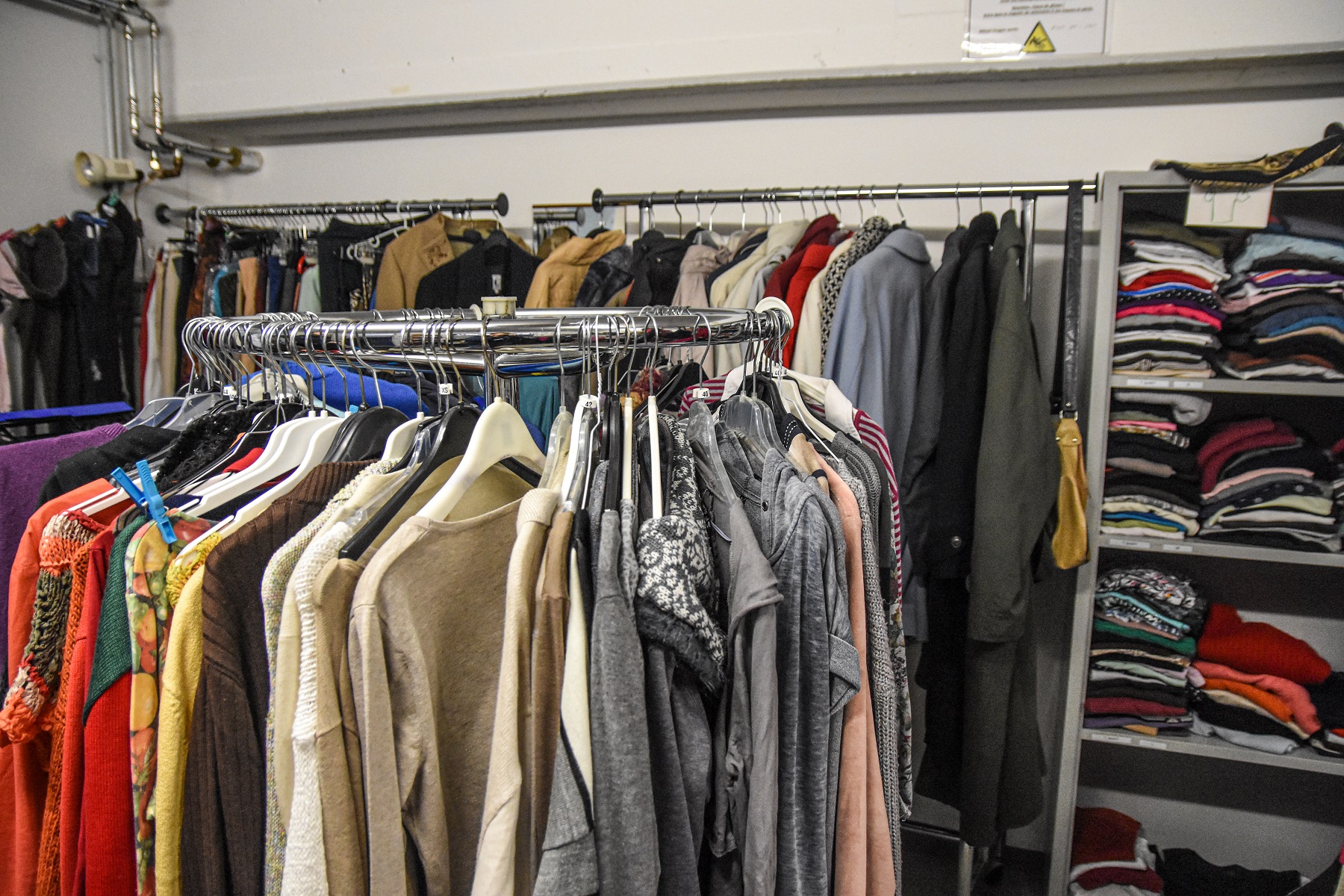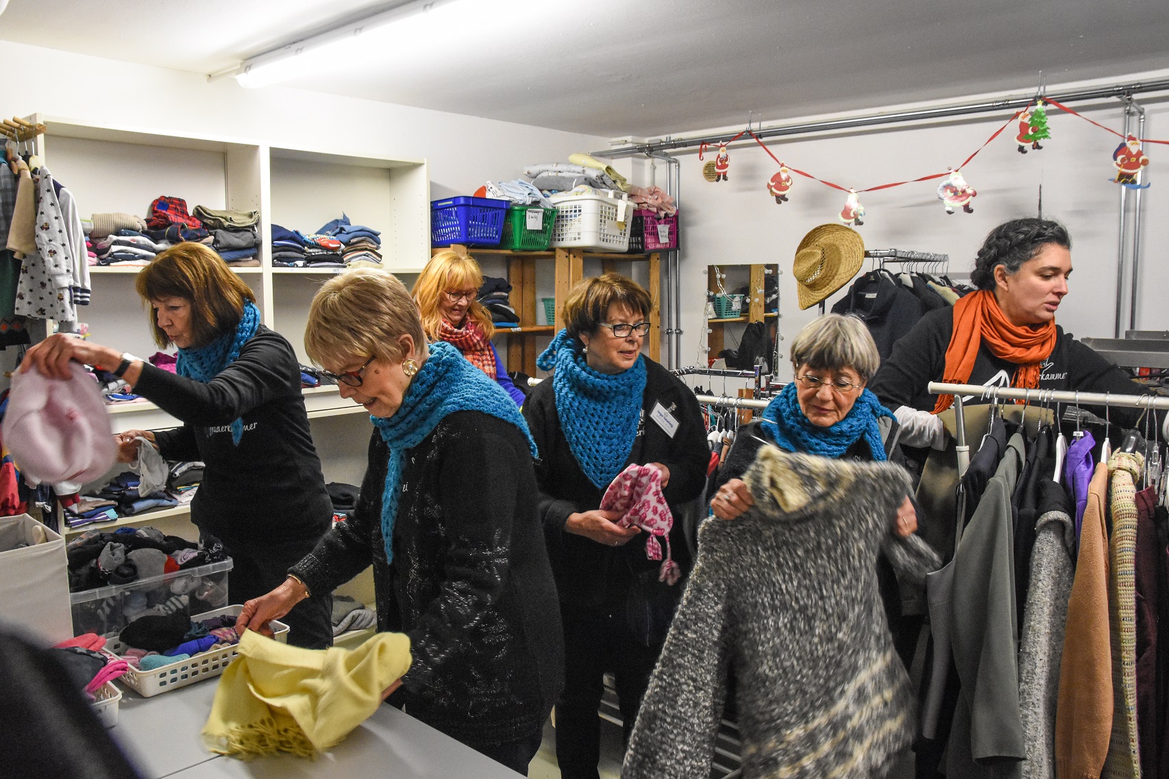 Sie machen es möglich: Ehrenamtlerinnen hängen in der gEMiDe-Kleiderkammer die neuen Spenden auf.