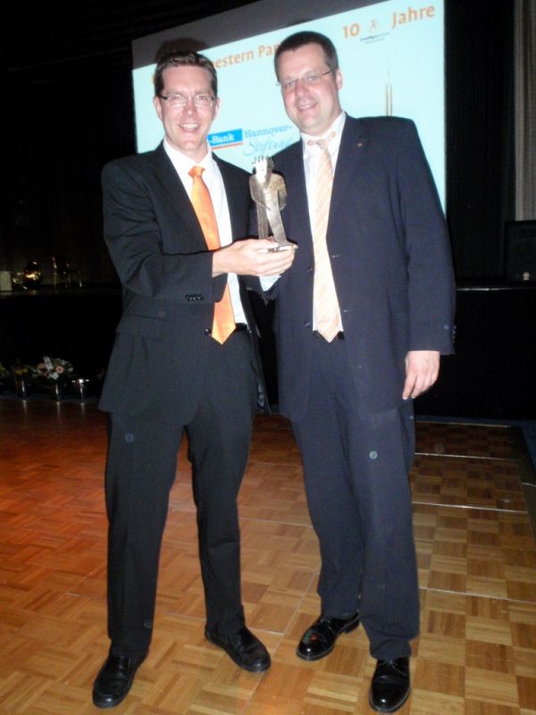 Gundlach-Geschäftsführer Lorenz Hansen nahm die von der hannoverschen Künstlerin Ulrike Enders gestaltete Skulptur freudestrahlend entgegen: "Ein besonders sympathischer Preis der uns in unserem Engagement für soziale, kulturelle und ökologische Belange in der Region bestärkt".