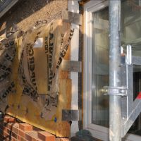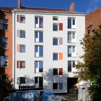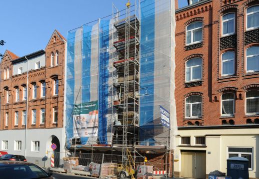 Wie das gesamte Gebäude bekommt auch sein Rückseite ihren effektiven Wärmeschutz durch 16 cm dicke Mineralwolle (WLG 035). Mit Putz und frischen Farben, die den einzelnen Tonwerten der Klinker entsprechen, wird sie den Garten des Hauses verschönern und neue, größere Balkone werden den Mietern mehr Raum an frischer Luft geben.