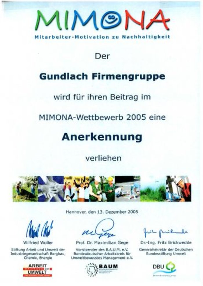 Verleihung einer Anerkennung für den Beitrag der Firmengruppe Gundlach im MIMOMA-Wettbewerb (Mitarbeiter-Motivation zu Nachhaltigkeit).