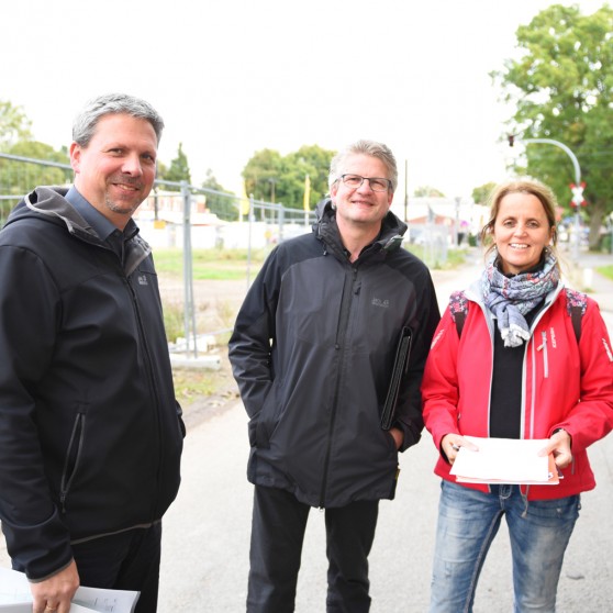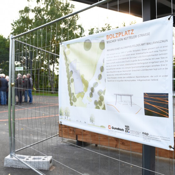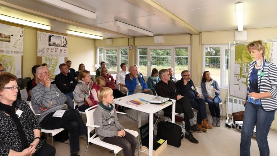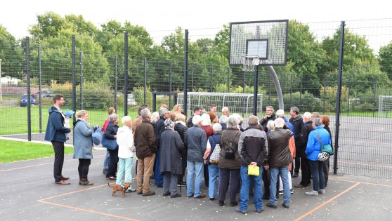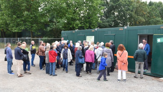 Parallel zum Workshop gab es für 50 Bau-Interessierte Bothfelder eine Exkursion im und rund ums Baufeld, die Silke Leniger vom Kulturtreff Bothfeld organisiert hatte. Treffpunkt war der von Gundlach neu errichtete Bolzplatz; der alte lag im neuen Baufeld. Gemeinsam mit Jens Ludwig und Andreas Kramer vom Gundlach Bauträger ging es auf Erkundung. Erläuterungen zur Planung gabe es vorm Baucontainer.