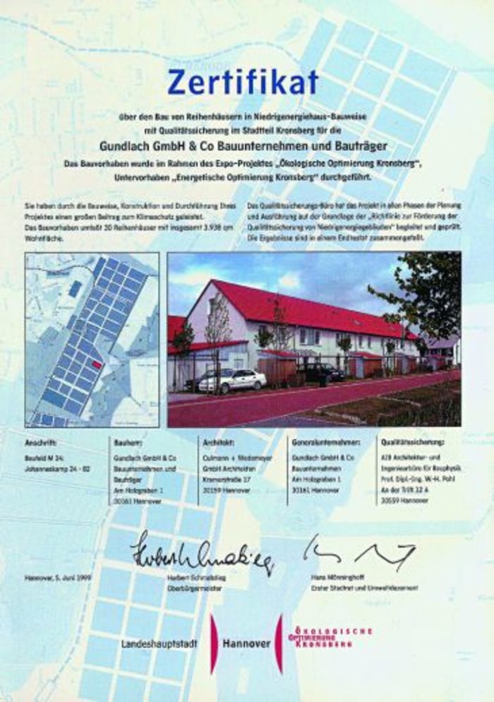 Zertifikat über den Bau von Reihenhäusern in Niedrigenergie-Bauweise mit Qualitätssicherung im Stadtteil Kronsberg für die Gundlach GmbH & Co Bauunternehmen und Bauträger.
