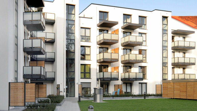 - 26 Wohnungen, 2 bis 4 Zimmer, 60–110 m² (barrierefreies Gebäude) mit Balkon oder Terrasse jeweils zum Innenhof