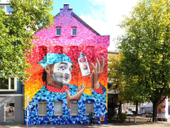 An der Kreuzung zur Celler Straße ist es nicht mehr zu übersehen, ein farbenfrohes Kunstwerk an den grauen Betonbauten: Das Gesicht eines Mannes, bemalt mit einer Clownsmaske. Er jongliert mit einer Spray-Dose. Auf der Dose stehen die Namen der beiden Künstler und deren portugiesische Herkunft. Ergänzt wird das Kunstwerk mit regenbogenbunten Dreiecken, die sich auch in den Klamotten des Mannes wiederfinden. Das Wandgemälde entstand 2016. Die Streetart-Künstlerin Mansha Friedrich holte dafür zum zweiten Mal internationale Künstler*innen nach Hannover, in diesem Fall die zwei Graffiti-Sprayer namens MrDheo und ParizOne.