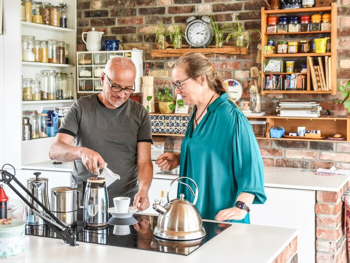 Gäste seien oft erstaunt, wenn sie das Haus betreten, berichten die beiden. Die lichtdurchfluteten Räume oder die alten Ziegelsteine in der Wohnküche schaffen eine Wohlfühl-Atmosphäre. Die Holzwände machen die Zimmer gemütlich. „Das hat seinen ganz eigenen Charme. Es ist wie in einer Skihütte", sagt Weinlich. Was weniger auffällt: Das Haus hat kein Wohnzimmer. Die Wohnküche ist größer, ansonsten aber haben alle Räume ähnliche Maße. „Es gibt keine Hierarchie, alles ist gleichberechtigt", sagt Bothmann und fügt hinzu: „Man kann sich hier im Haus zurückziehen, aber auch treffen." Am liebsten sitzen die beiden auf einem Sessel in der geräumigen Wohnküche.