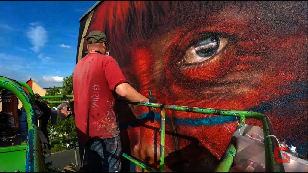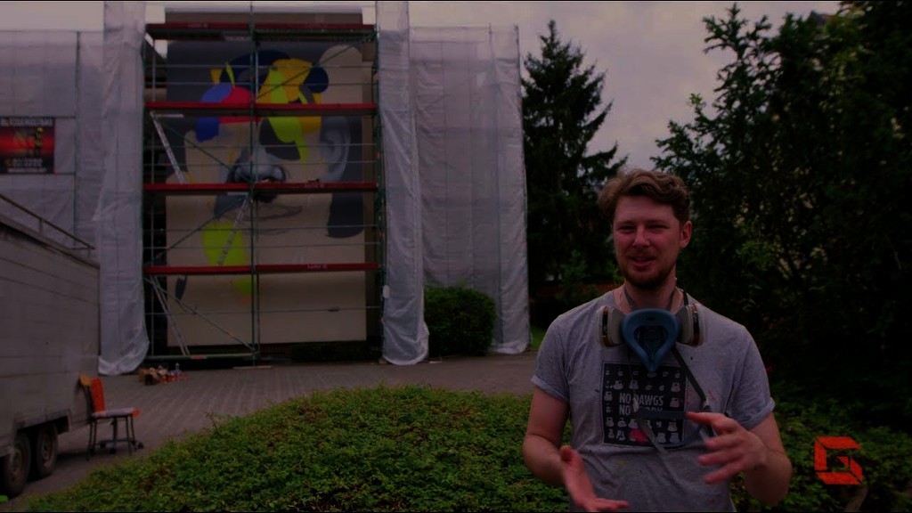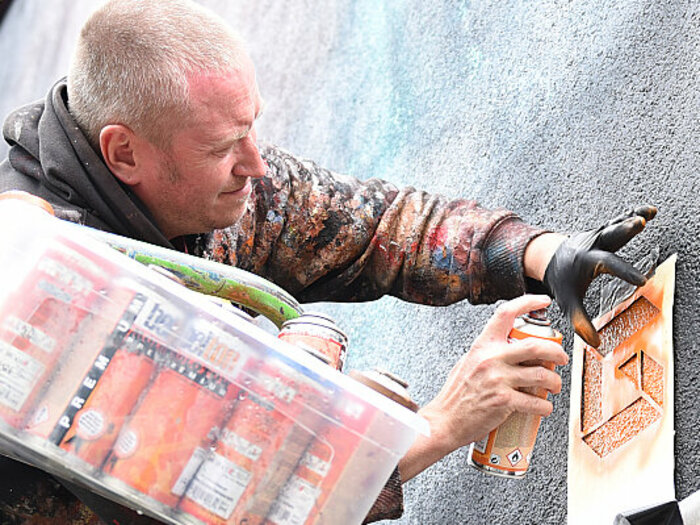 Der britische Künstler Dale Grimshaw sprayt das Gundlach G auf seine Graffiti.