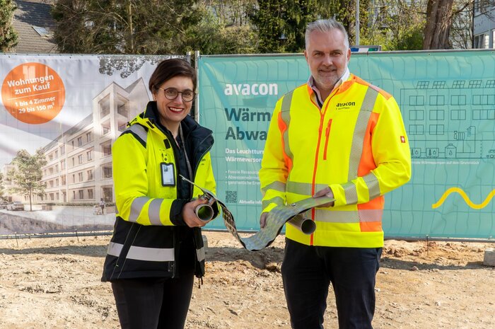 Gundlach-Geschäftsführerin Nadine Otto und Avacon-Natur-Geschäftsführer Torsten Hausmann zeigen ein Teil des Abwasser-Wärmetauschers.