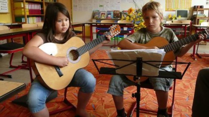 Die Kinder machen Musik auf den Instrumenten Cello, Violine, Gitarre, Blockflöte, Akkordeon und Klavier / Keyboard. Anhand kleiner Tänze, Lieder und Klanggeschichten werden die Spielmöglichkeiten der Instrumente untersucht, entdeckt und ausprobiert. Ziel dieses viermonatigen Unterrichtsangebotes ist, mit altersgerechten Stücken Lust und Interesse am gemeinsamen Musizieren zu wecken. Die Instrumente werden den Kindern leihweise zur Verfügung gestellt, so dass jedes Kind die Möglichkeit hat, sich für eine ganze Unterrichtseinheit mit seinem Instrument improvisatorisch frei oder nach exakter Anweisung zu beschäftigen.