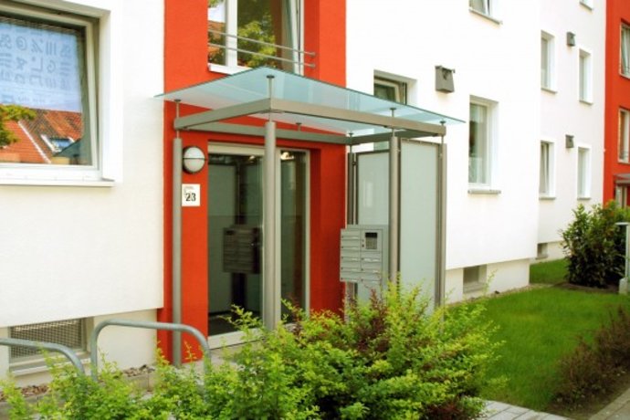 Gleichzeitig wurden im Rahmen dieser energetischen Modernisierung bei allen drei Häusern die Hauseingänge mit neuen Türen, Vordächern und Briefkästen aufgewertet und die Häuser mit frischen Farben verschönert sowie die Grünanlagen aufgearbeitet.