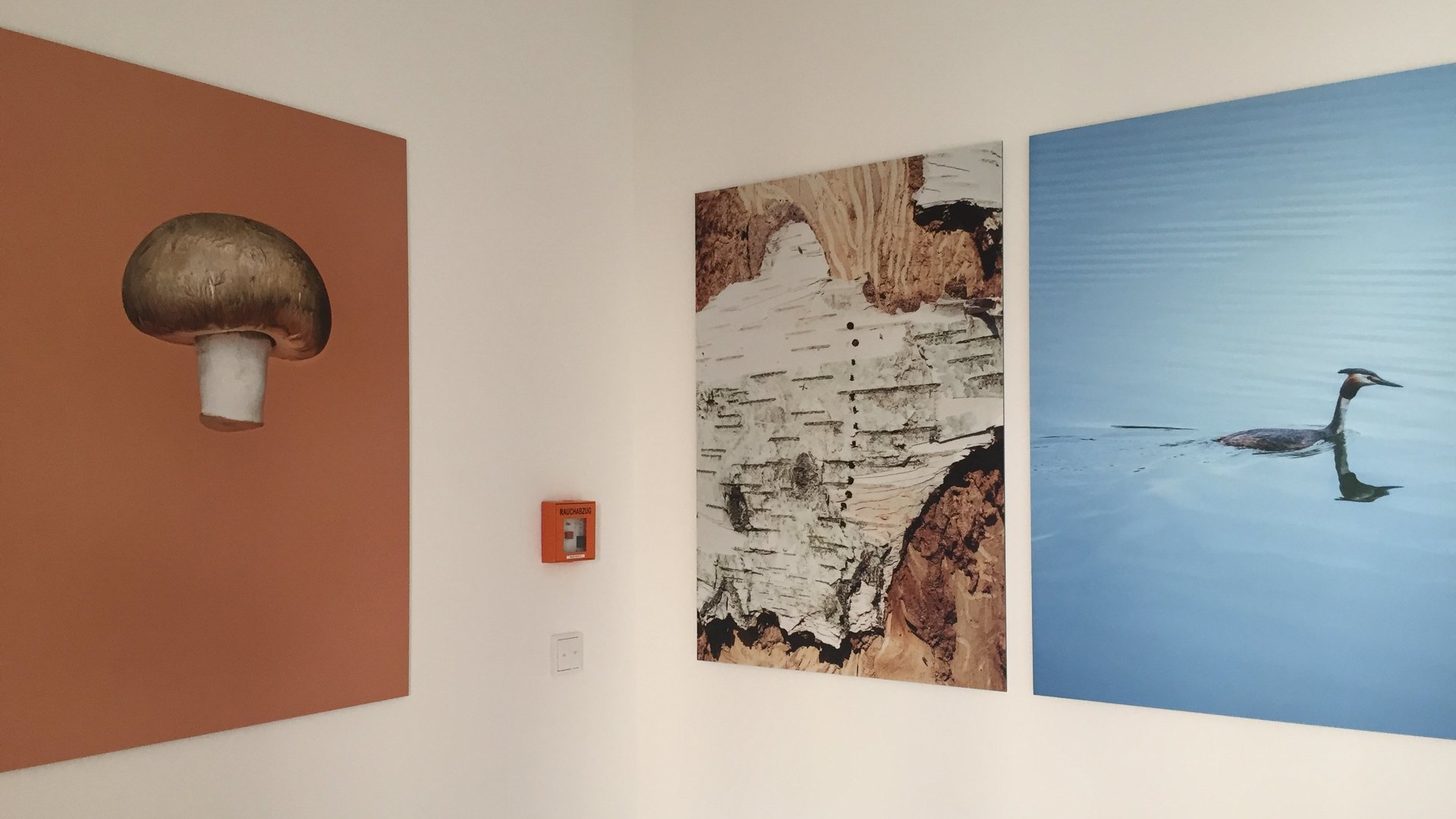 Das Grundstück der Eigentumsanlage grenzt direkt an den Wald. Den Keller prägen kleine Fotos von Pilzen. Auf dem Weg durch das Treppenhaus trifft man auf Blumen, Wildschweinaugen oder Entenfedern, bis zum Obergeschoss, wo Schwalben in Wolken in großen Formaten zu sehen sind, die fast an der Raumdecke angebracht sind. Ein Zusammenspiel mit den Ausblicken der Treppenhausfenster, gestaltet durch die Fotografin Angelina Vernetti.