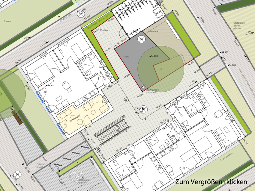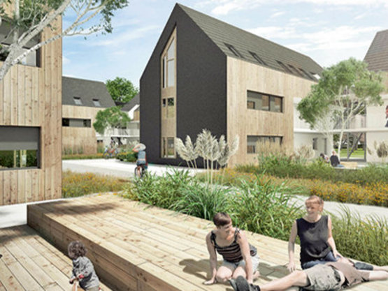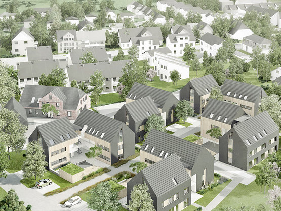 Gemeinschaft: Je 2 der 10 Häuser sind mit einem gemeinsamen Laubengang zu einem L-förmigen Gebäude zu je sieben Wohnungen verbunden. Ein halböffentlicher Hof sowie der gemeinschaftlich nutzbare Laubengang bilden das Zentrum. Neben den Gemeinschaftsräumen entstehen großzügige öffentliche Flächen, die sich über Grün- und Spielbereiche bis in die halböffentlichen Wohnhöfe öffnen. Der Hof – mit größerem Gemeinschaftsbezug – funktioniert zudem als Schnittstelle zwischen Nachbarschaft und dem Wohnquartier als Ganzem. Die späteren Bewohner lernen sich frühzeitig kennen und wissen, dass sie sich auf größere Nähe und zwischenmenschlichen Austausch einlassen.