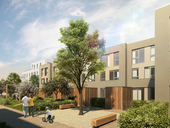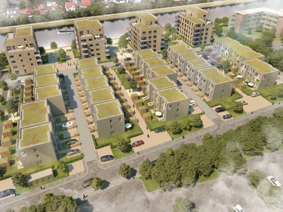 Umfang: 8 Doppelhaushälften und 32 Reihenhäuser in verschiedenen Hausbreiten, aufgelockerte Bebauung durch 2 Wohnhöfe und private Anliegerstraßen