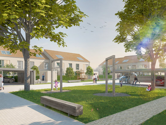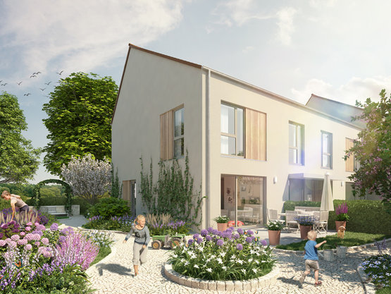 Im Preis enthalten: Carport, Abstellraum mit extensiv begrüntem Dach und Gartengestaltung mit Obstbaum, gasbetriebenes Blockheizkraftwerk, 2 kindgerechte Spielplätze