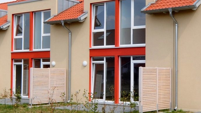 Hohe Flexibilität durch Wahlmöglichkeit unterschiedlicher Grundriss- und Ausstattungsvarianten. Wintergartenähnliche Vor- und Rückbauten lassen viel Licht ins Haus. Zentrale Wärmeversorgung der Reihenhauszeilen mittels Holz-Pellet-Heizung.