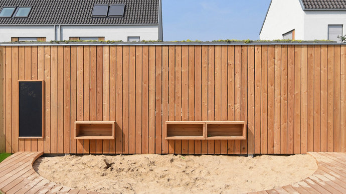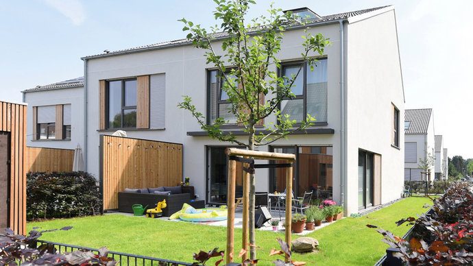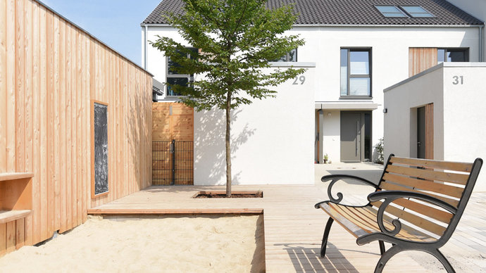 Im Preis enthalten: Carport, Abstellraum mit extensiv begrüntem Dach und Gartengestaltung mit Obstbaum, gasbetriebenes Blockheizkraftwerk, 2 kindgerechte Spielplätze