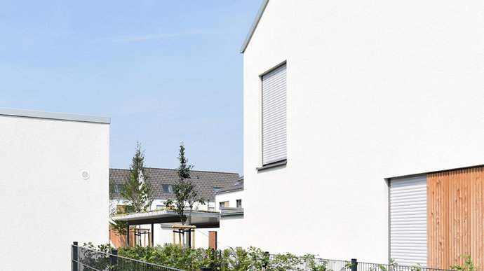 Umfang: 8 Doppelhaushälften und 32 Reihenhäuser in verschiedenen Hausbreiten, aufgelockerte Bebauung durch 2 Wohnhöfe und private Anliegerstraßen