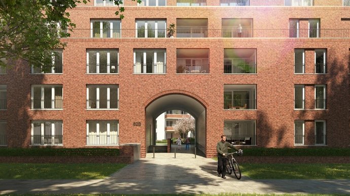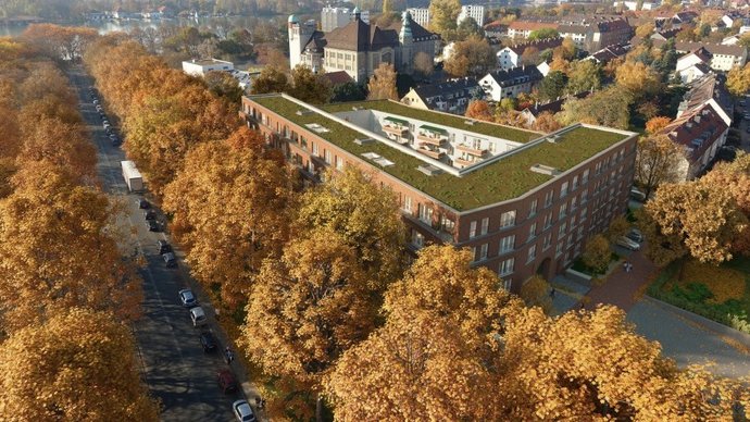 Der Siegerentwurf der Architekten gruppeomp interpretiert das Flair des "Backstein-Stadtteils" völlig neu. Die Blockrandbebauung umschließt den üppig begrünten Innenhof (Landschaftsarchitekten Iad + Diekmann). 80 Wohnungen bieten absoluten Komfort von 31 bis 226 Quadratmeter. Tiefgarage, Aufzug und Carsharing-Plätze sind selbstverständlich vorhanden.