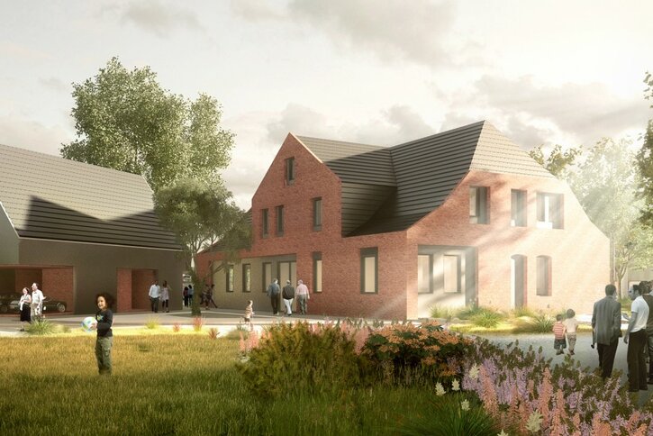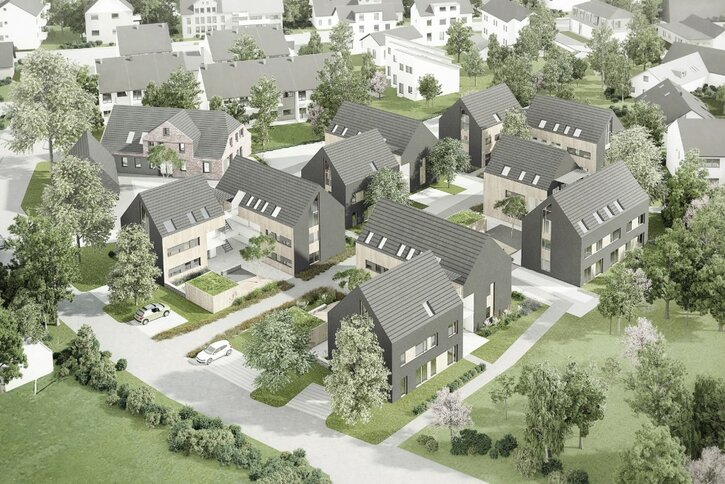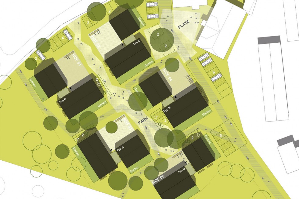 Der zweigeschössige Bau mit seinen 18 Wohnungen ist teils unterkellert. Dort befinden sich die technischen Räume und die Abstellräume für alle Wohnungen. Der Wohnungszugang erfolgt über Laubengänge und eine vor der Fassade vorgelagerte Treppe. Die Laubengänge sind nach Nordwesten zum Kirchenplatz ausgerichtet. Eine bestehende Reihe von Stielbuchen schirmt die Privatsphäre der Wohnungen vom Kirchenplatz ab. Ein Plattform-Lift verbindet das EG mit dem Kellergeschoss, so dass alle Wohnungen im EG behindertengerecht sind. Für die Fassadengestaltung ist an den Giebelseiten eine vorgehängte Ziegelfassade angebracht die Laubengänge und die Balkone sind aus Kalksandsteinen mit Hanfdämmung errichtet. Teilflächen aus Holzschindeln ergänzen die Fassade nach Südosten.