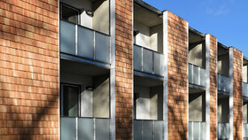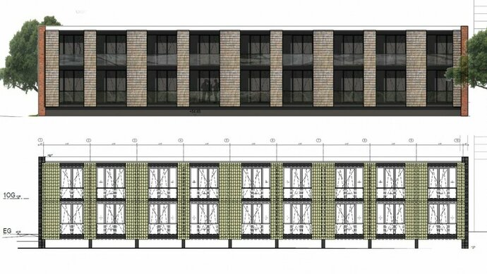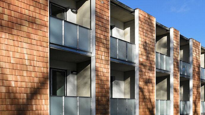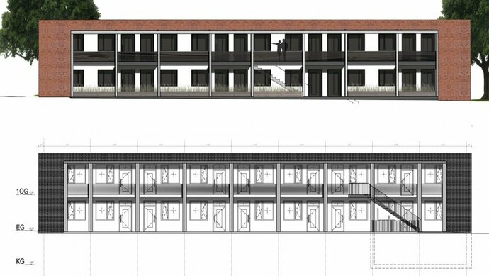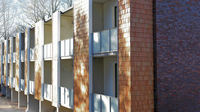 Die 18 Wohnungen mit jeweils ca. 41 m² Wohnfläche verteilen sich auf zwei Geschosse. Jede der Wohnungen ist mit zwei gleichwertigen Zimmern und einem Bad ausgestattet . Das Zimmer zum Laubengang hat die Funktion des Eingangsbereiches und der Küche. Das Zimmer nach Südosten hat die Funktionen Wohnen und Schlafen. Daran angeschlossen ist ein Balkon, der über einen kleinen Abstellraum verfügt. Zwischen den beiden Zimmern liegt das Bad, das über einen Flur zu erreichen ist. Alle Bäder sind mit WC, Dusche und Waschbecken ausgestattet und rollstuhlgerecht.