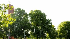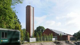 Der frei stehende Glockenturm ist prägend für das Erscheinungsbild der Matthiaskirche in Groß-Buchholz. In seiner Nachbarschaft, an der Roderbruchstraße 4, hat das Wohnungsunternehmen ein zweigeschossiges Wohnhaus mit insgesamt 18 Wohnungen gebaut und vermietet.
