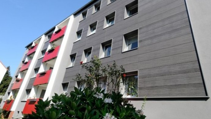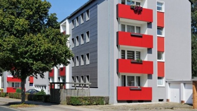 Die Dachböden der zwei Mehrfamilienhäuser in der Richard Lattorf Straße 23-25 und 27-29, Baujahr 1962, mit 32 Wohnungen wurden bereits 2010 mit einer 20cm Wärme- dämmung versehen. Für den effektiven Wärmeschutz der Fassaden sorgt jetzt das Sto-Therm-Cell-Wärmedämm-Verbundsystem. Diese umweltfreundlichen, frei von schädlichen Treibhausgasen produzierten Wärmedämmplatten bestehen aus den natürlichen Komponenten Kalk, Zement, Quarzsand sowie einer wässrigen Hydrophobierung (wasserabweisend) und sind 100 Prozent recyclebar. Die Straßenfassaden der Häuser wurden zusätzlich mit Fassadenplatten ergänzt. Die Mineralwolleplatten bestehen aus Basalt, einem Vulkangestein mit hervorragenden Dämm- und Witterungseigenschaften und sind ebenfalls vollkommen recyclingfähig. Alle Balkone wurden vergrößert neu aufgebaut. Mit ihren in Rottönen verkleideten Zementfaserplatten geben sie der Fassade Struktur und ein frisches Gesicht. Die Dächer beider Häuser wurden komplett neu eingedeckt.